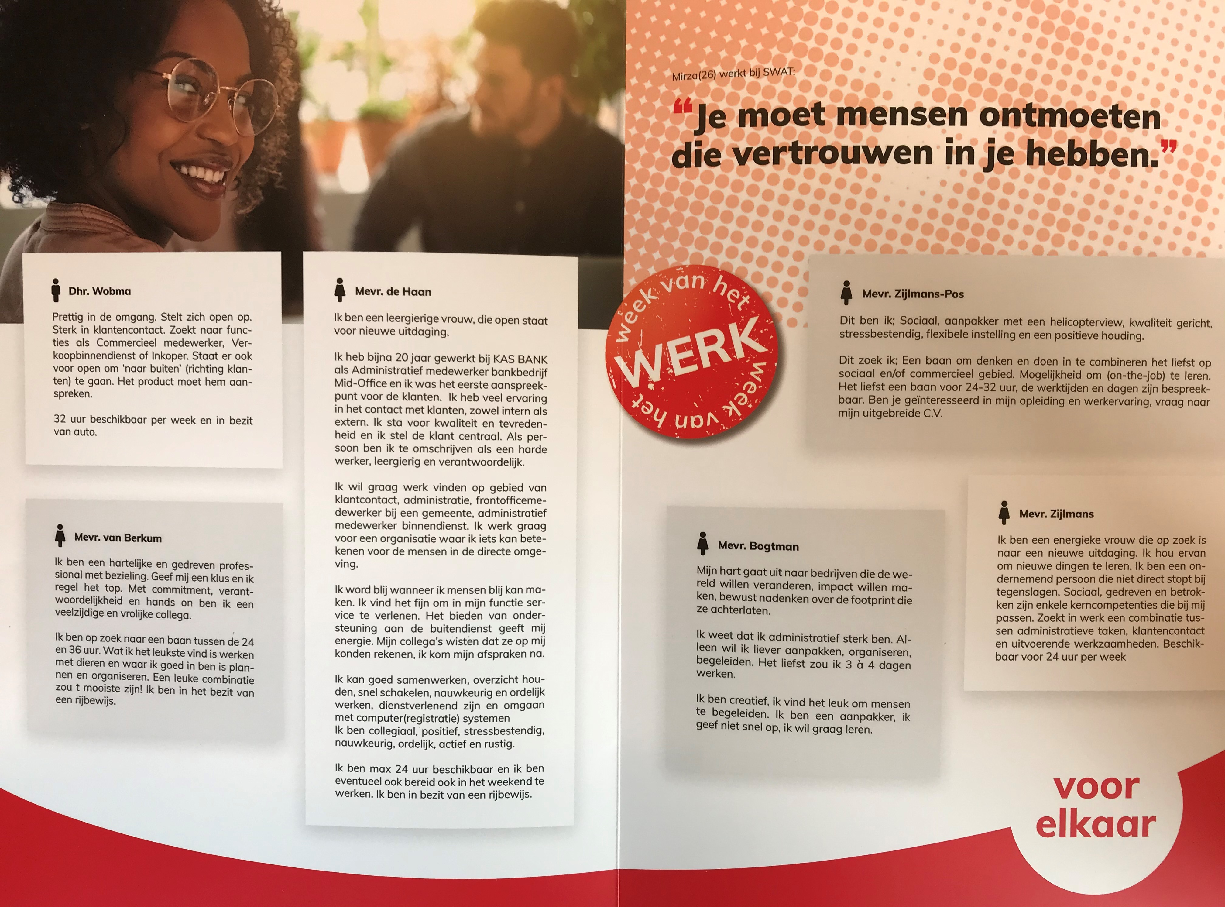 In het kader van de Week van het Werk, willen wij namens het WerkgeversServicepunt de volgende kandidaten uit ons bestand bij u onder de aandacht brengen. Stuk voor stuk gemotiveerde kandidaten die hard op zoek zijn naar een nieuwe uitdaging. In deze krant worden de kandidaten kort, maar krachtig geïntroduceerd.