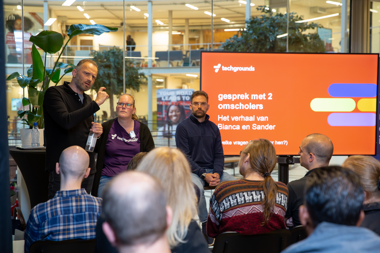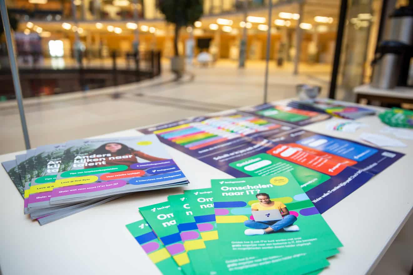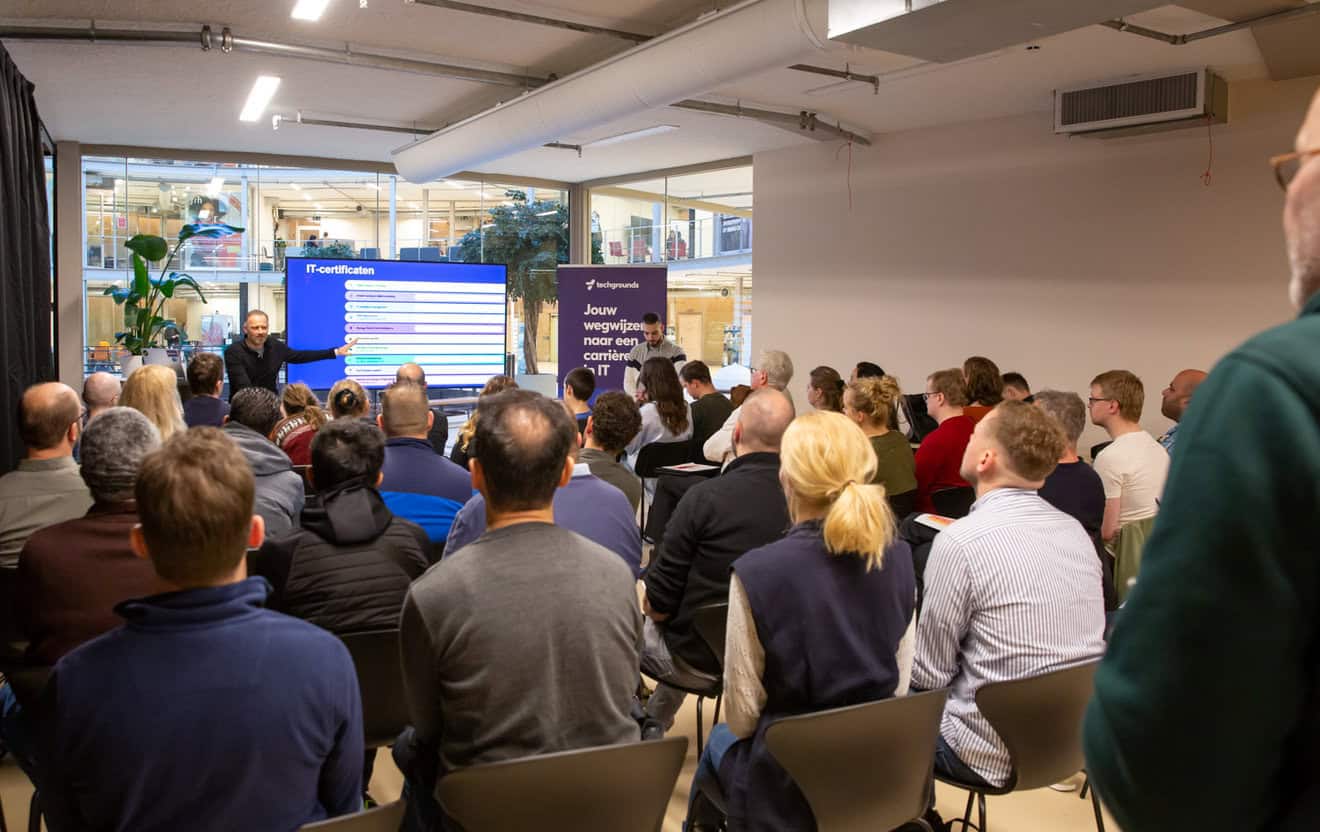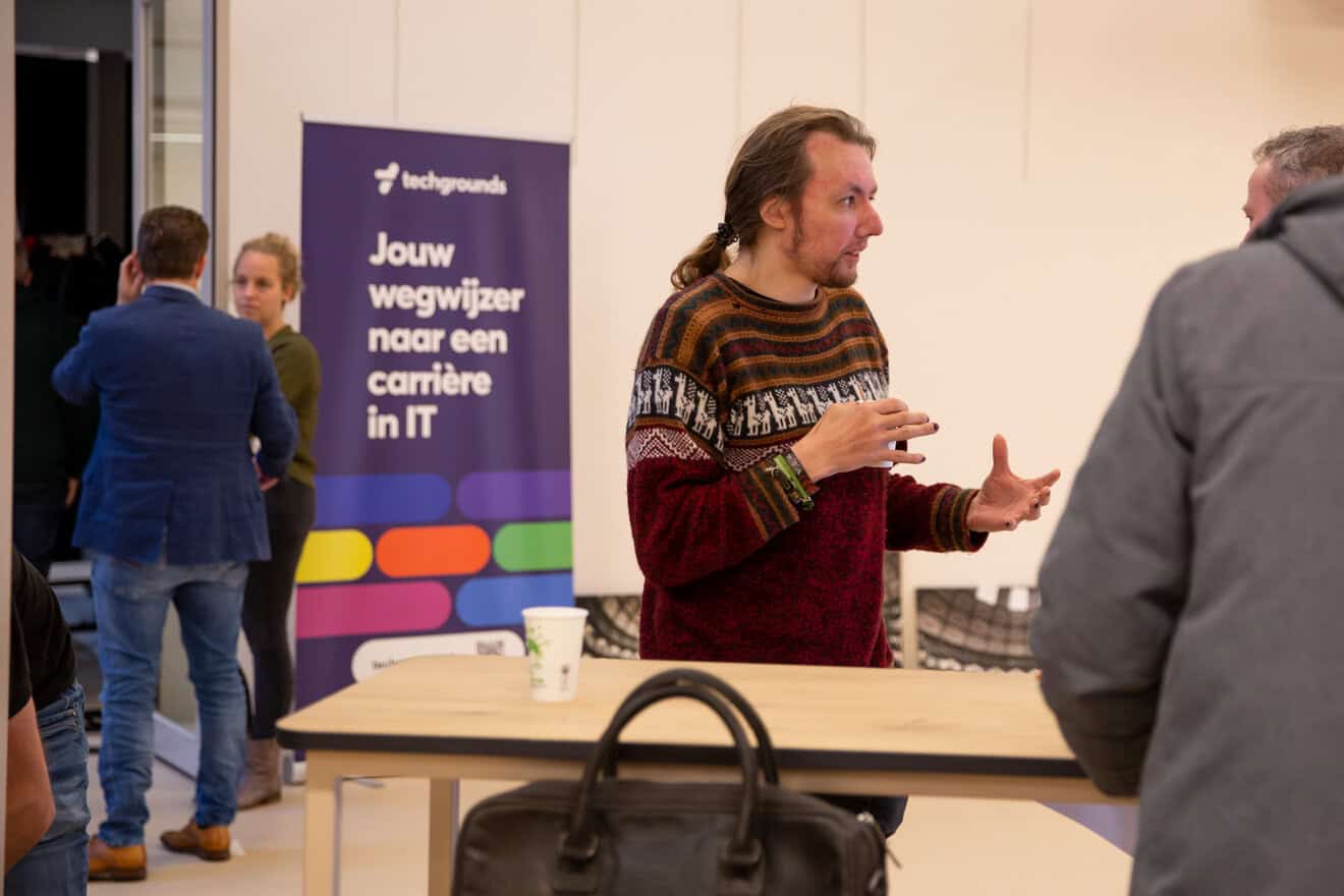 ‘We werken al langer samen met Techgrounds voor individuele arbeidsbemiddeling. Dit was de eerste keer live en voor een groot aantal mensen’, aldus Pascal. Techgrounds helpt werkzoekenden en mensen die willen omscholen, ontdekken welke IT-baan past bij hun kennis en vaardigheden. Ze hebben daarvoor een oriëntatietraining ontwikkeld en ze werken samen met IT-opleiders. Deze opleidingen met baangarantie variëren in duur, de kortste opleiding is zes weken en de langste zo’n negen maanden.